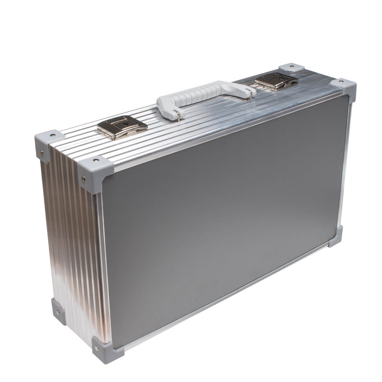 Stabile Aluminium-Rahmenkonstruktion mit hellgrauen Kunststoff-Schutzecken und grauem Rücken/Deckel, innen schwarz. Je 2 Reihen à 10 Flachkarabinerhaken im Boden und im Deckel zur einfachen und blitzschnellen Schlüsselbefestigung.