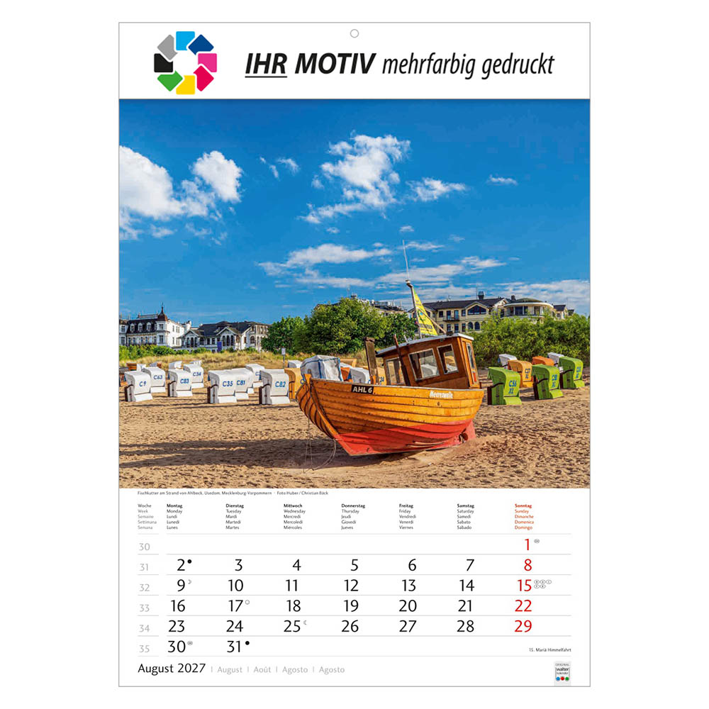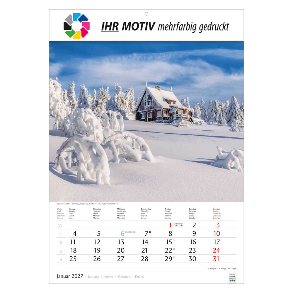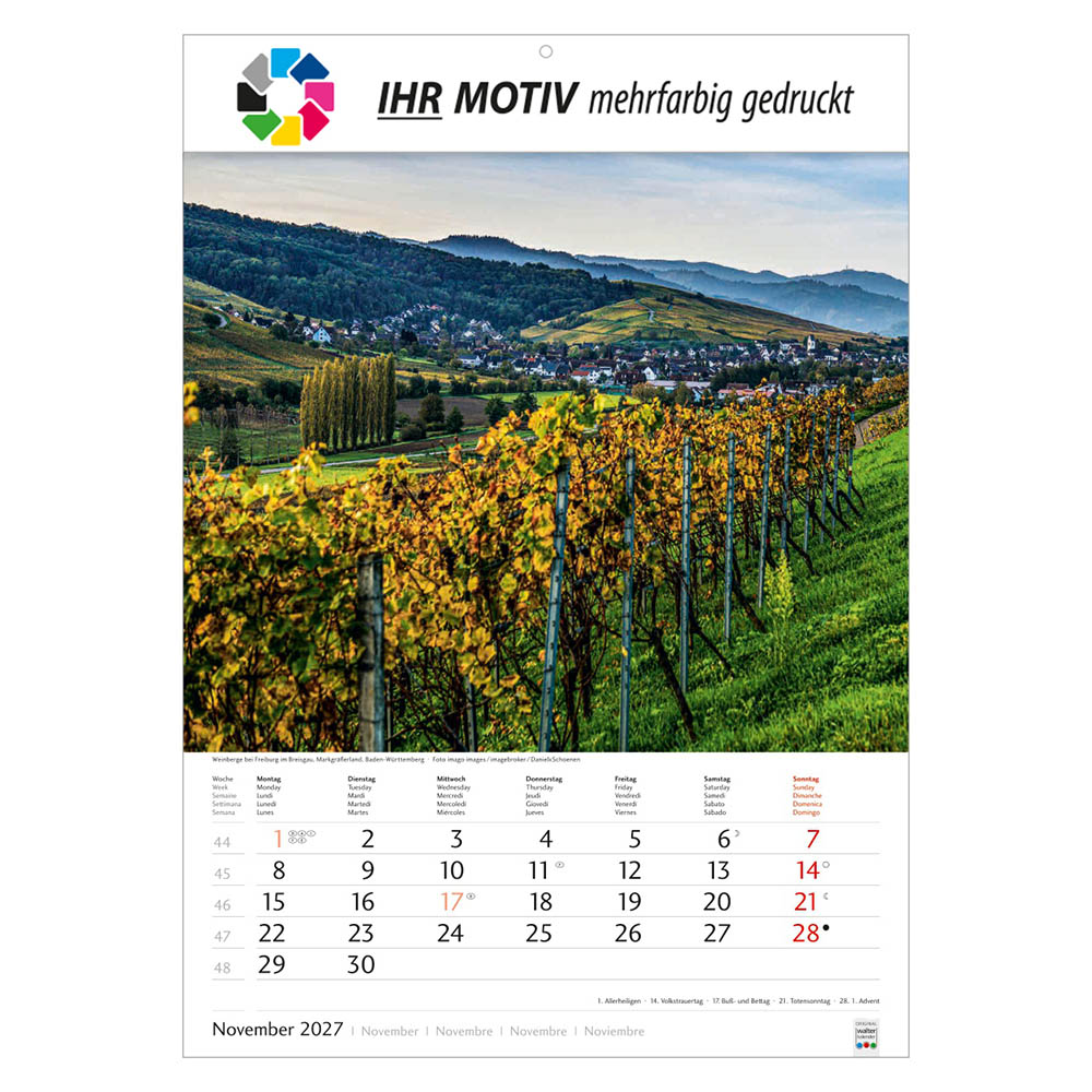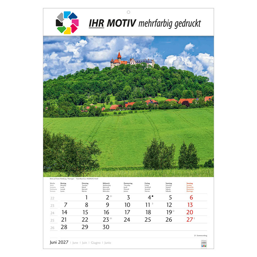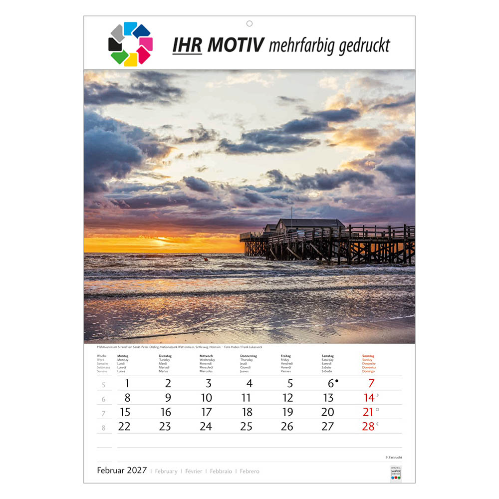 Der Bildkalender Schönes Deutschland 2027 präsentiert eindrucksvolle Landschaftsmotive aus allen Regionen Deutschlands. Mit großem Werbefeld für Ihr Logo eignet sich der Heimatkalender perfekt als Werbekalender oder Firmenkalender. Hochwertig verarbeitet, mit nationalen Feiertagen und praktischer Terminübersicht ist er ein beliebtes Werbegeschenk.