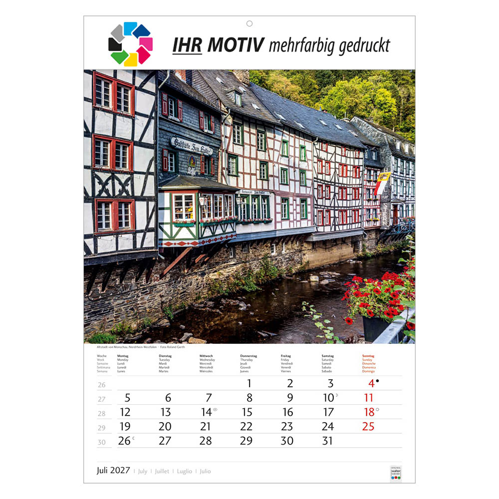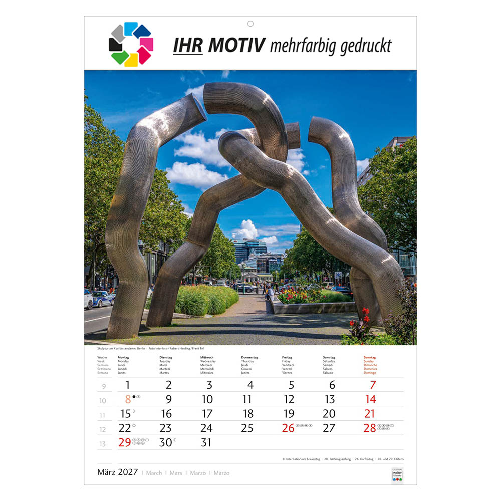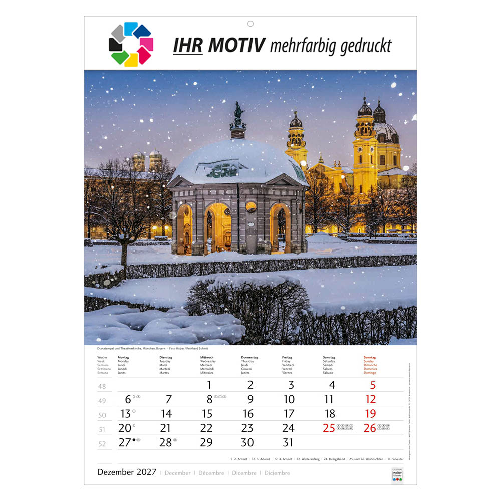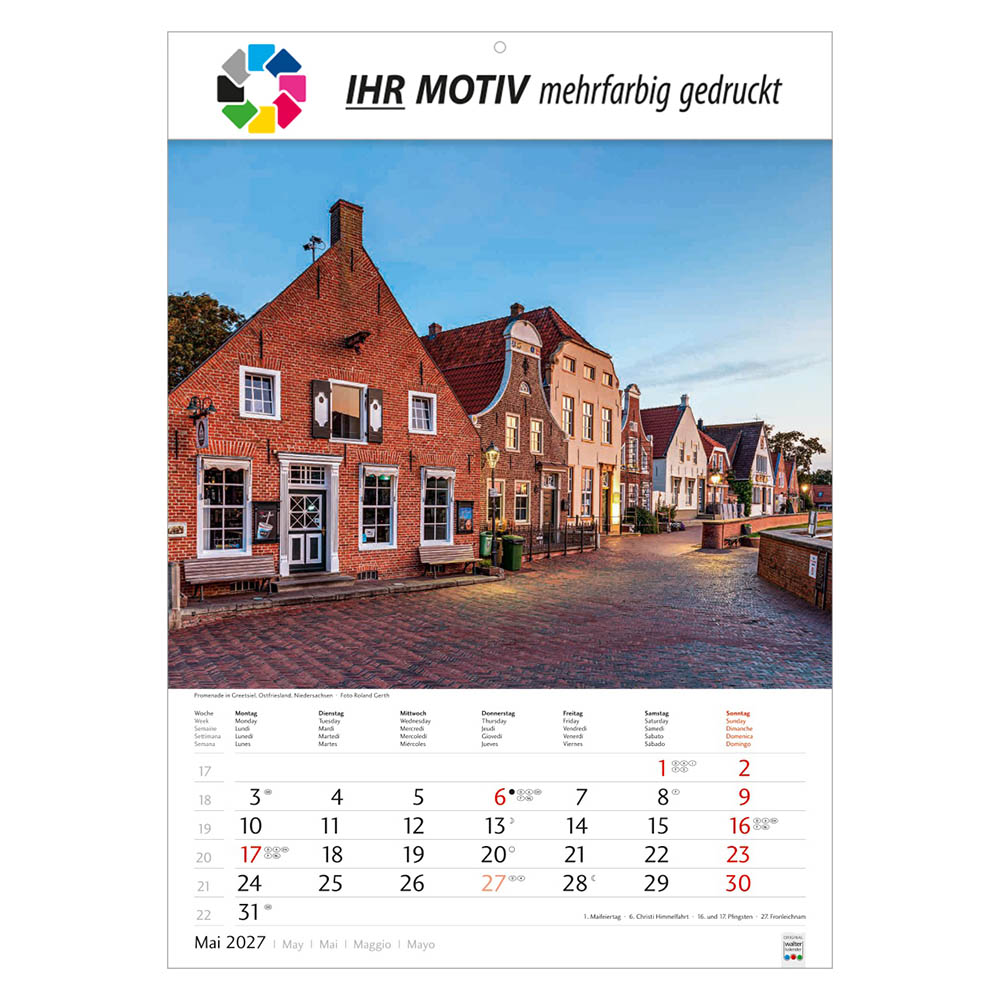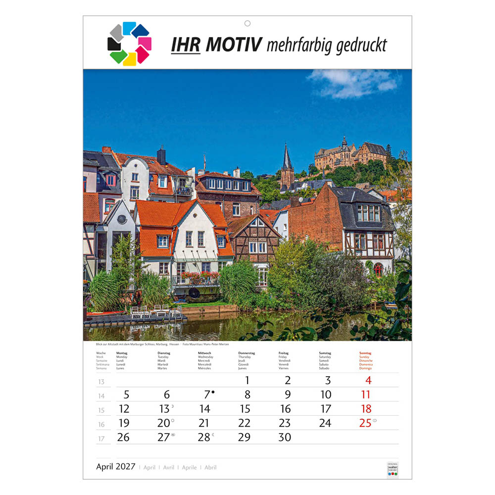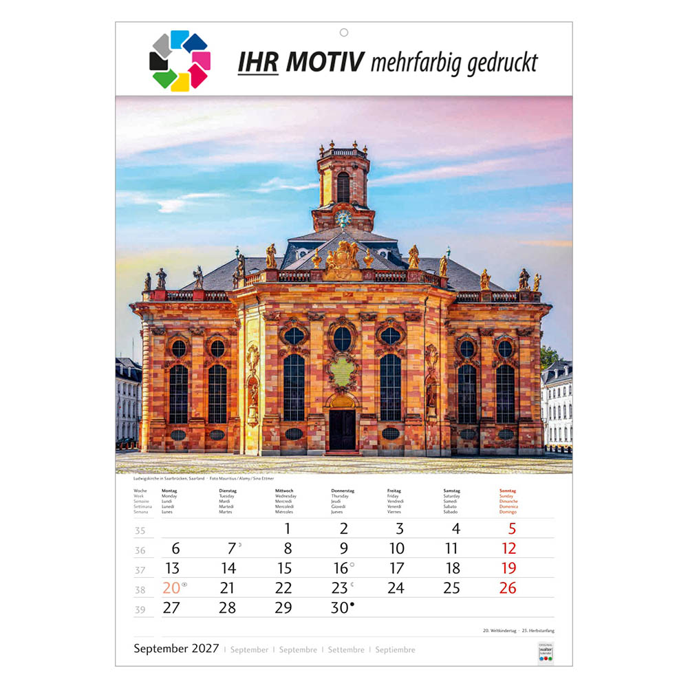 Der Bildkalender Schönes Deutschland 2027 präsentiert eindrucksvolle Landschaftsmotive aus allen Regionen Deutschlands. Mit großem Werbefeld für Ihr Logo eignet sich der Heimatkalender perfekt als Werbekalender oder Firmenkalender. Hochwertig verarbeitet, mit nationalen Feiertagen und praktischer Terminübersicht ist er ein beliebtes Werbegeschenk.