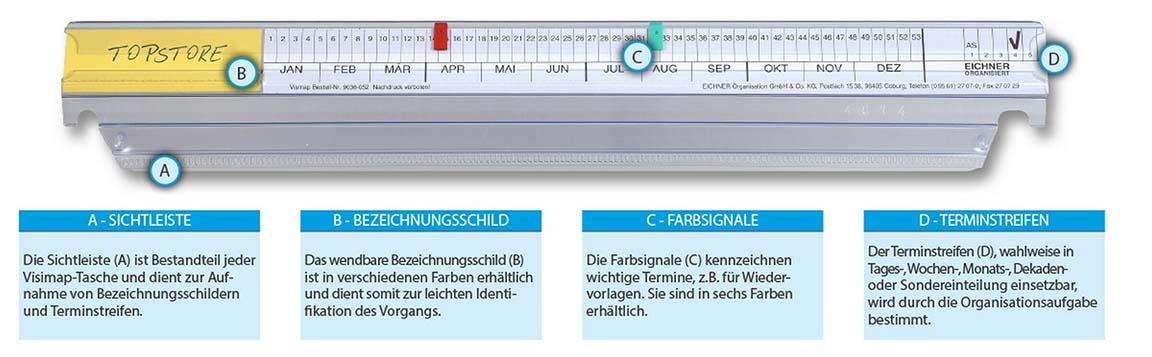 Organisationstasche "Visimap" DIN A4 zur Aufbewahrung wichtiger Dokumente. Von Werbemaßnahmen bis zu Bestellungen, von Lieferungen bis zu Service-Terminen, vom Angebotsmanagement bis zur Auftragsvorbereitung und noch viele Anwendungen mehr, lassen sich mit diesem Termin-Kontrollsystem übersichtlich verfolgen. In der Multifunktions-Hängetasche, einer Kombination aus Informations-Sichtleiste und Unterlagen-Klarsichttasche, lassen sich Schriftstücke optimal aufbewahren, Termine planen und diese vor allem sicher kontrollieren.