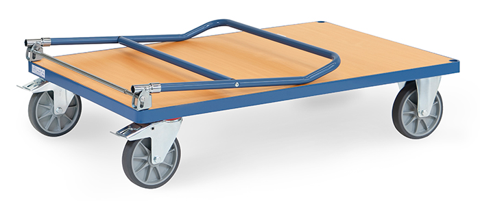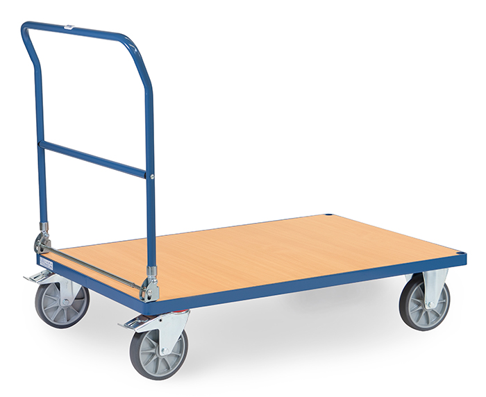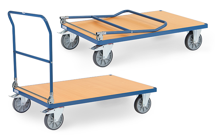 Modell 2501-K | Klappwagen aus Stahlrohr und Profilstahl geschweißt, pulverbeschichtet brillantblau RAL 5007. Ladefläche aus Holzwerkstoffplatte, Oberfläche Buchendekor. Schiebebügel auf Plattform klappbar. 2 Lenk- und 2 Bockrollen, TPE-Bereifung (spurlos), Naben mit Rillenkugellager. Feststeller an den Lenkrollen, gemäß der Europäischen Norm EN 1757-3 (Sicherheit von Plattformwagen).