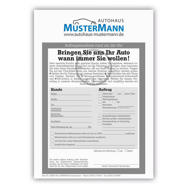 Auftragstasche Kundendiensttasche für 24-Std. Annahme in der KFZ-Werkstatt. Perfekt für den Einwurf von KFZ-Scheinen und Fahrzeugschlüsseln ausserhalb Ihrer Geschäftszeiten / Servicezeiten für die Kraftfahrzeug Reparaturannahme. Einfach für Ihre Kunden, wenn diese nicht während der regulären Geschäftszeiten Ihr Kraftfahrzeug persönlich bei der Serviceannahme abgeben können. Der vorderseitigen Vordruck "Werkstattauftrag" ermöglicht Ihren Kunden mitzuteilen, welche Servicearbeiten am Fahrzeug ausgeführt werden sollen. Auftragstasche im Format C5 zur Aufnahme bis DIN A5 formatige Dokumente sowie KFZ-Schein und Fahrzeugschlüssel.